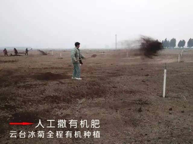 云臺冰菊基地人工施撒有機肥。